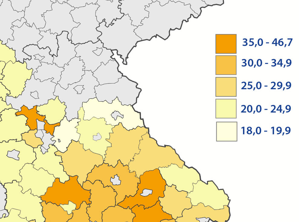 In Rheinland-Pfalz gibt es einige Landkreise unter den TOP50. Insbesondere fallen hier der Eifelkreis Bitburg-Prüm (28,5) und Bernkastel-Wittlich (26,6) auf. Im Landkreis Trier-Saarburg werden immerhin noch 20,9 Häuser pro 10 TSD Einwohner gebaut. Auffällig ist die unmittelbare Nähe zu Luxemburg und Belgien. Vielleicht ist dies mit ein Grund für die verstärkte Bautätigkeit.
