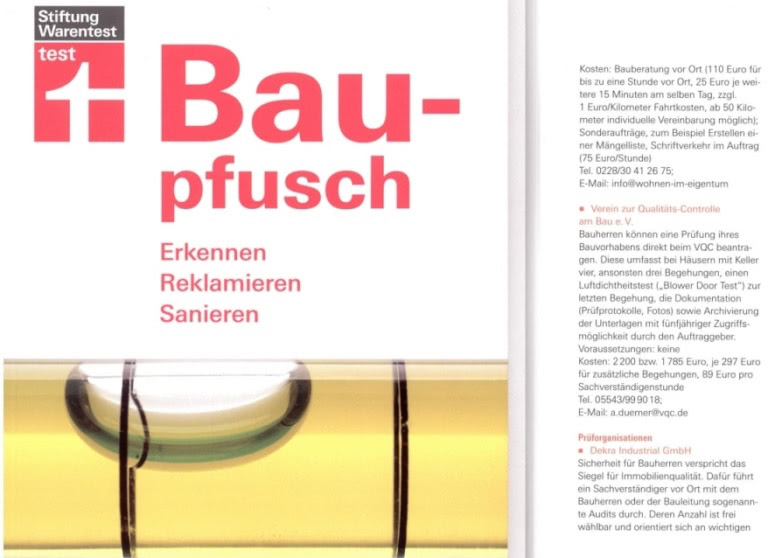Die Stiftung Warentest hat gerade ein Buch zum Thema Pfusch am Bau herausgegeben. Unter den Verbraucherverbänden für die baubegleitende Qualitätskontrolle wird auch der VQC mit Leistungen, Kosten und Kontaktdaten aufgelistet.